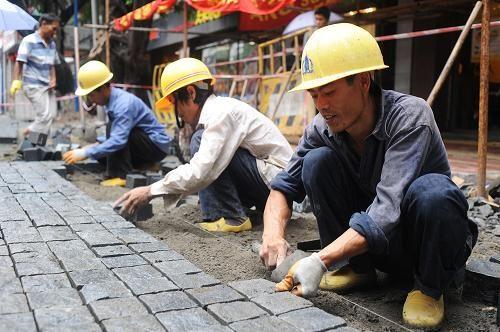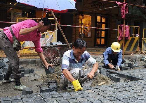 工人們在為廣州市惠福路鋪上灰麻石