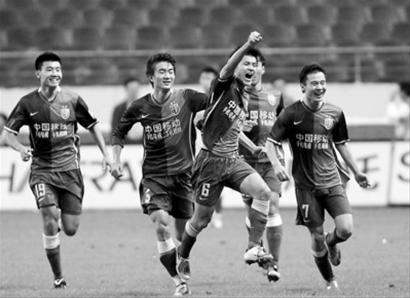 于濤(中)與隊友慶祝進球。 本報記者 邵劍平 攝