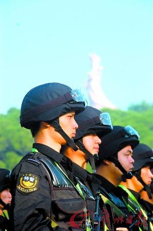 誓師大會上,60名特警隊員佩戴防暴頭盔配護目鏡,穿作訓服、作訓背心、作戰(zhàn)手套,帶10頭警犬,持微型沖鋒槍、狙擊步槍,顯得威風凜凜。而另外的4個武警安保方隊、4個邊防安保方隊、消防安保方隊、防恐處突安保方隊、陸軍方隊、海軍方隊、空軍方隊也分別亮相。