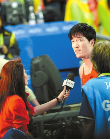 在賽道上僅僅逗留了13秒48,但在賽道一側的混合區里,近百名記者已經等候了數十分鐘。終于,翹首企盼的飛人出現在通道的頂頭,狹窄的混合區里開始騷動,志愿者不得不手扶擋板,免于崩塌。