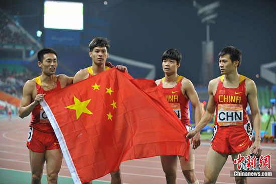 中新網11月26日電 在26日晚結束的廣州亞運會田徑男子4x100米接力決賽中,新科亞洲“百米王”勞義與陸斌、梁嘉鴻和蘇炳添組成的中國隊以38秒78的歷史最好成績奪得冠軍,20年之后再次奪得亞運會接力冠軍。