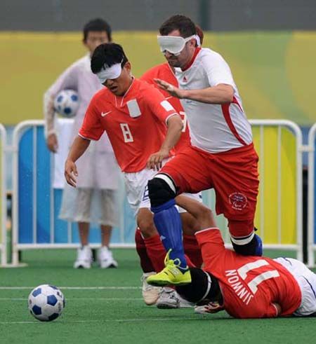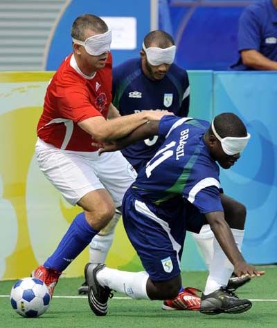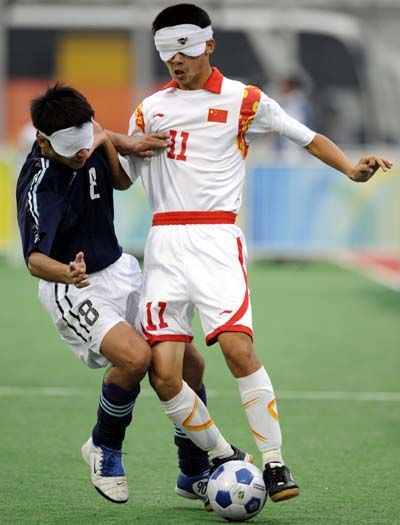 由于隊(duì)員視力問題,比賽中隊(duì)員只能依靠球發(fā)出的聲響來判斷球的位置,所以經(jīng)常會出現(xiàn)隊(duì)員找不到球的情況。在進(jìn)攻方向上還經(jīng)常要依靠引導(dǎo)員的幫助,隊(duì)員間的呼應(yīng)較多,所以攻防速度沒有普通的五人制足球快,傳接球次數(shù)相對也較少,烏龍球出現(xiàn)會多一些。 (來源: 亞殘運(yùn)會官方網(wǎng)站)