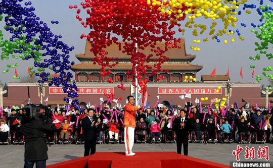 中新網(wǎng)北京12月4日電 2010年廣州亞洲殘疾人運(yùn)動會火炬點(diǎn)燃暨火炬?zhèn)鬟f活動啟動儀式,今日上午在北京人民大會堂北大廳舉行。中共中央政治局常委、國家副主席習(xí)近平在啟動儀式上點(diǎn)燃主火炬,并宣布火炬?zhèn)鬟f活動開始。