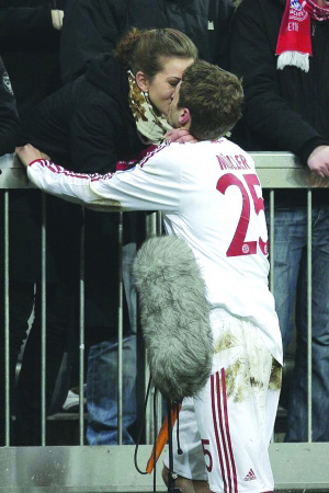 這位在租借而來的前鋒多諾萬回到美國大聯盟之后才得到出場機會的小將,在昨晨比賽的第72分鐘登場,這也是他在歐冠聯賽中的處子秀,然而17分鐘過后,他就在一次角球混戰中攻入了個人的歐冠聯賽處子球。進球后的穆勒顯得非常興奮,飛奔到看臺上女友所在的位置,而他的女友很默契地送上了浪漫一吻。看到這對恩愛的小情侶,現場所有觀眾都送出了自己的掌聲。