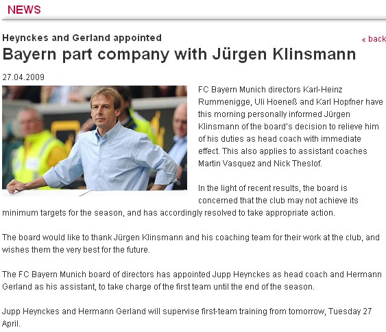 拜仁慕尼黑隊的聲明說,拜仁的主管魯梅尼格等高管27日一早已經通知了克林斯曼,俱樂部管理層已經決定將其解職,該解職令即刻生效。同時被解雇的,還有克林斯曼的助理教練巴斯克斯(Martin Vasquez )以及特斯洛夫(Nick Theslof)。