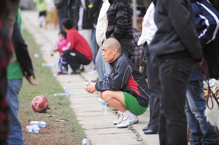 從成仁路轉(zhuǎn)到中和街道的新華路,再穿過轉(zhuǎn)角路口的雜貨部和鹵菜攤,一條小路出現(xiàn)在了面前,路牌掛在一棵高大的桉樹上,紅底白字,上面寫著足球場和游泳池。順著小路進去,兩邊盡是農(nóng)地,機耕道有些顛簸。5分鐘后又看到了一塊牌子,也是紅底白字:成都最牛的山寨足球俱樂部——“中和聯(lián)隊俱樂部”就“藏”在這里訓(xùn)練。走過停著幾部名車的簡陋停車場,兩塊草皮足球場隨即映入眼簾。俱樂部老板唐勇訓(xùn)練正酣,而旁邊一名隊員則從球場邊的菜地里把射偏的球撿了回來。“來哇,一起踢耍!”唐勇干脆而熱絡(luò)地打起招呼。