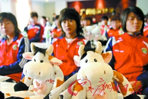 昨天是圣誕節(jié),正在廣州集訓(xùn)的中國女足首次亮相越秀山體育場。在參加由四國女足邀請賽冠名贊助商南方人才市場主辦的新聞發(fā)布會時,球員們收獲了一份意外的“圣誕禮物”:身上印有“kiss me (親我)”英文字樣的奶牛公仔。贊助商這一別出心裁的禮物,讓包括韓端、畢妍在內(nèi)的女足姑娘們個個愛不釋手。