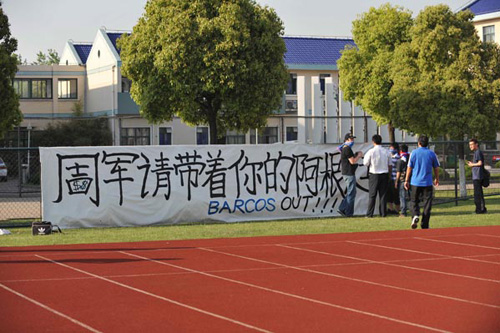 由于7日是申花的訓練開放日,因此這幾名球迷進入基地一開始并未引起大家的注意,不過當他們試圖在申花宿舍樓對面的鐵絲網展開這個橫幅時,俱樂部工作人員趕緊進行了阻攔,并將他們“友好”的請出了基地。