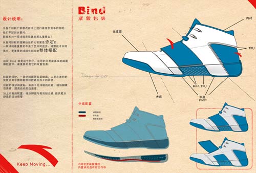 評委從外觀到用材,從設(shè)計創(chuàng)意到人體工程學等方方面面對參賽作品進行考察,入選作品能夠最終落入大賽評委“法眼”的根本原因在于設(shè)計的獨特創(chuàng)意以及作品中所體現(xiàn)出的深厚的運動專業(yè)主義素養(yǎng)。比如戰(zhàn)袍作品“長城”,以長城作為CBA戰(zhàn)袍的設(shè)計源頭,言簡意深;俠影的設(shè)計靈感分別來源于古代披風,唐裝,五線譜,天馬行空4種元素,極具英雄浪漫主義色彩;“ANTA--‘箭魚’籃球鞋”,取材于海洋生物——箭魚,鞋身整體造型以流線型為主,色彩明快,動感十足;戰(zhàn)靴“Bind-緊緊包裹”,設(shè)計強調(diào)鞋面的包裹性,后腳踝的包裹性,和前掌的反應速度,定位于速度反應型后衛(wèi)選手,并且提供良好的保護;“My Design My CBA”戰(zhàn)靴作品,設(shè)計中STAR主題貫穿鞋面,大面積的紅令人眼前一亮。而在后跟的承托上大面積的透明TPU,從后跟一直包裹到鞋身上,大大增強了鞋的穩(wěn)定性,保證在猛烈的切入動作時,雙腳不會產(chǎn)生側(cè)滑……