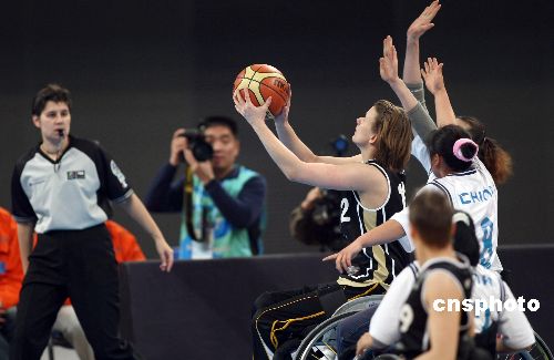 國際輪椅籃球邀請賽中國男隊無力阻擋荷蘭男隊進攻。