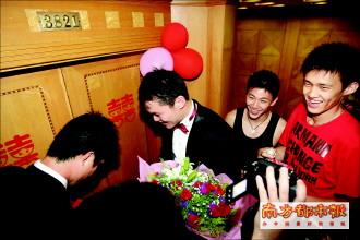 姚明、王治郅、易建聯(lián)、郭士強、阿的江、李楠等多位受邀的賓客因時間安排問題不能前來,但昨晚價位2888元/桌的喜筵在宏遠酒店國際宴會中心還是擺了62桌,超過600位賓客到場賀喜。剛剛帶中國U18國家男籃打完亞青賽的李春江及時從伊朗返回,杜鋒和劉曉宇、周鵬分別從烏魯木齊和拉斯維加斯訓練營趕回來,還有來自北京的胡加時、白喜林、匡魯彬等籃協(xié)領導,劉玉棟、呂嘵明等明星球員,再加上新娘子前藝術體操隊的一眾靚女隊友,整個婚禮仍不失為一場體育圈的明星派對。