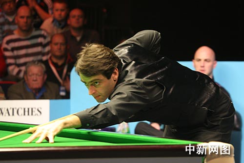 “火箭”奧沙利文在十一日進(jìn)行的斯諾克英錦賽中,不到兩小時就以九比一大勝對手馬克·金,輕松進(jìn)入八強。圖為奧沙利文在比賽中。