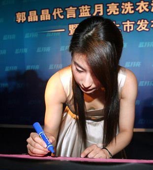 2008年11月24日,奧運跳水冠軍郭晶晶作為代言人出席某洗衣液品牌在北京舉行的新產品發布活動。雖然北京天氣比較寒冷,但郭晶晶還是相當有敬業精神地穿上性感露肩金色連衣裙彰顯貴氣。不過,郭晶晶身穿低胸連衣裙俯身在嘉賓名冊上簽名的時候竟然不慎走光,嬌美的乳溝在蘭色內衣的點綴下顯得相當性感。