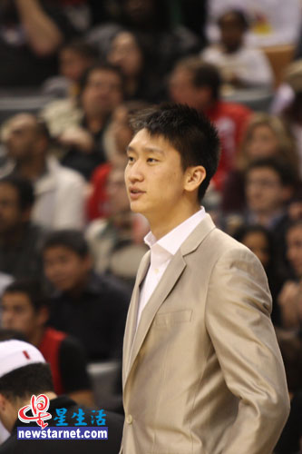 身著西裝的孫悅更多的時間只是靜靜地坐在場邊觀戰。只是在比賽暫停期間,他才起身與隊員一起傾聽主教練對比賽的部署。在中國孫悅是一個很有實力的球員,但在NBA卻不得不從板凳上站起。