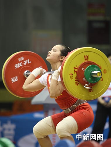 中新網重慶4月24日 (孟幻 李楊陽)第十一屆全國運動會女子舉重預賽暨全國女子舉重錦標賽24日在重慶揭幕。在當天比賽中,各隊運動員隱藏實力,只求擦邊挺進全運會。北京奧運冠軍陳燮霞無緣錦標賽獎牌,但她誓言奪取全運會金牌。
