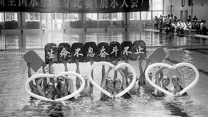 在“你說你的美麗已經(jīng)不再,地動(dòng)山搖將你變得蒼白”的朗誦聲中,阿壩師專拉拉操隊(duì)員開始了他們的自選動(dòng)作表演——一套反映從地震發(fā)生時(shí)的無助到重建家園信心十足的水中健身操。