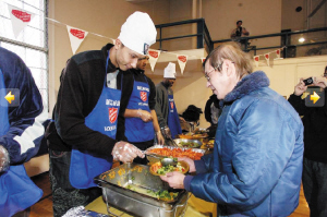 昨天,易建聯(lián)(左圖左一)和卡特、哈里斯等籃網(wǎng)隊(duì)員一起來(lái)到新澤西的一家教堂,在感恩節(jié)到來(lái)之際,向當(dāng)?shù)厣鐓^(qū)貧困居民分發(fā)食品。在活動(dòng)現(xiàn)場(chǎng),易建聯(lián)身著便裝頭戴一頂繡有籃網(wǎng)標(biāo)志的廚師帽發(fā)放食物,整個(gè)活動(dòng)過(guò)程中易建聯(lián)始終面帶微笑,并和獲贈(zèng)食物的居民親切交談。