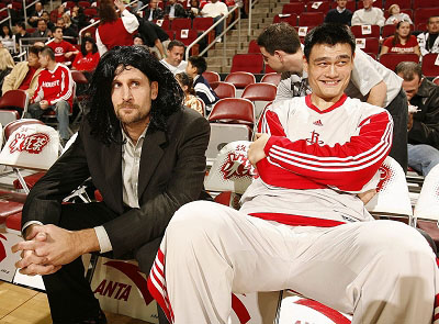 “斯科拉”一身黑西裝坐在姚明的身旁,旁邊的姚明捧腹大笑,嘴中還念念有詞。不,出了個小差錯,姚明身邊的人不是斯科拉,而是布倫特·巴里,他正戴著火箭為主場球迷們準備的斯科拉超酷假發頭套。賽前,前2000名來到豐田中心的球迷都會獲得斯科拉的假發頭套,坐在第一排的球迷和工作人員均戴上了假發套。這次斯科拉的假發頭套不僅讓球迷得到愉悅,就連姚明也笑得直不起腰來。