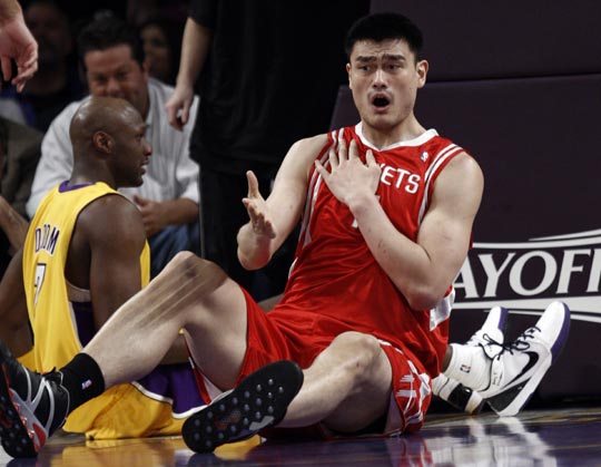 中新網5月7日電 北京時間今日,火箭和湖人的西部半決賽第二戰在斯臺普斯中心進行。這場比賽場面異常火爆,雙方都有球員因沖突下場。最終情緒不穩的火箭客場以98-111輸給了湖人,總比分被扳成1-1平。姚明砍下12分10籃板,但被吹罰5次犯規;阿泰25分,斯科拉12分小布13分巴蒂爾6分。湖人科比40分,加索爾22分。