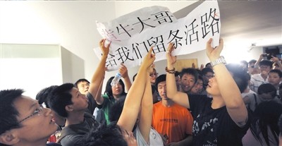 昨天上午11點,300余名國安球迷涌入國安足球俱樂部內(nèi)短短二三十米長的通道,他們高舉著“黃牛大哥,給我們留條活路”的標語,情緒十分激動,抗議“黃牛”壟斷門票,要求俱樂部保障球迷的利益。由于人數(shù)眾多,現(xiàn)場的暖氣片也被球迷擠壞,暖氣管道里的水灑了一地,廢棄的飲料瓶等雜物也隨處可見。陸續(xù)有數(shù)名民警趕到現(xiàn)場維持秩序,防止球迷出現(xiàn)過激行為。