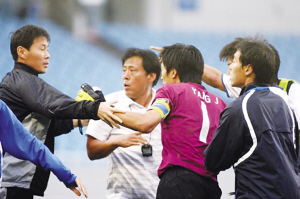 然而與舜天輸球相比,昨天比賽最大的看點就是被稱為“桑拿裁判”的陶然成在比賽中遭到天津隊圍攻的事情,由于對點球判罰的不滿,天津隊群情憤怒,如果不是南京公安的阻攔,差點就重演了天津全運隊爆追何志彪并一腳將其推倒的好戲。