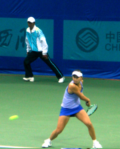 一襲紫裝、淺笑盈盈,率領(lǐng)天津隊奪得了中國第十一屆運動會濟南賽區(qū)首枚金牌的彭帥,和隊友李喆信步走進(jìn)中心賽場。四年前的南京,同樣是這個天津姑娘,十九歲的她站在領(lǐng)獎臺上淚流滿面,隨即賭氣似地摘下項上的銀牌。誰都知道,她想要的是金牌。四年后的濟南,十一運會網(wǎng)球女子團體賽中她拿到了金牌。今天,她又微笑著回來了。在今天上午的女子單打中,彭帥當(dāng)仁不讓,以二比零橫掃北京隊趙依靜。