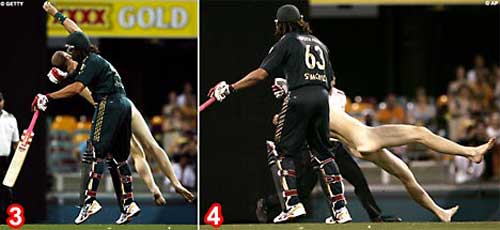 環球時報·環球網消息:3月4日,澳大利亞布里斯班市的加巴體育場內,澳大利亞國家板球隊同印度板球隊的對抗賽正在進行中。一名不速之客闖進了場地內,這名男子一絲不掛的飛奔在板球場上,與球場保安、球員玩起了“貓鼠游戲”。最后,這名“勇敢”的裸奔者被一名運動員擊倒在場地內,被警察帶出場地。迎接他的將是永遠不能踏進加巴球場的懲罰。