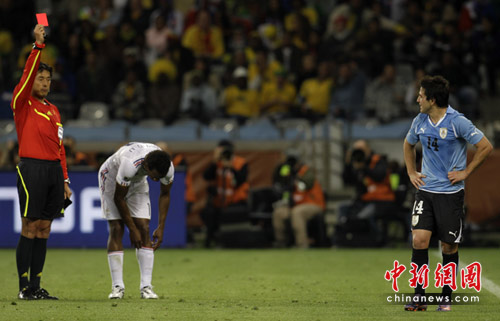 雖然場面上法國隊占據優勢,但烏拉圭隊防守十分頑強,攻勢一道禁區前沿基本上就被化解。但烏拉圭的反擊也并不犀利,場面一直陷于混沌。第58分鐘,維克托里諾兇狠的鏟倒埃弗拉,吃到一張黃牌,法國隊也獲得了一個位置不錯的前場任意球。古爾庫夫將球打到外線,里貝里大力遠射偏出。