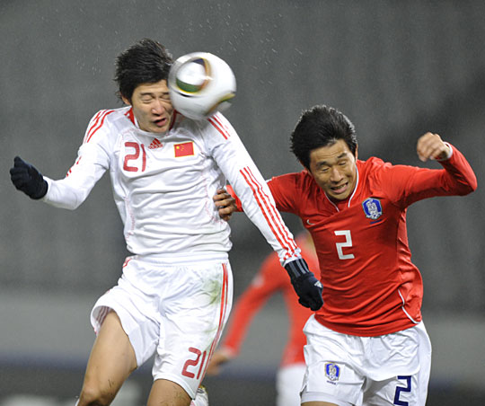 比賽開始后僅4分鐘,中國隊就率先打破場上僵局。是時曲波下底傳中,于海適時跟進頭球破門,為國足先拔頭籌,中國隊獲得了一個夢幻般的開局。隨后的比賽雙方互有攻守,韓國隊一度打的比較主動,第19分鐘對手的遠射被楊智飛身撲出,3分鐘后對手小角度射門,雖然偏出但也頗具威脅。