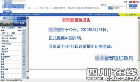 在另外一家博彩網站,同樣是存款界面,中國國內借記卡的一欄已經成了空白,付款只能通過點擊國外信用卡才可以進行,包括國內雙幣信用卡也不能使用。此外,還有一家網站竟然掛出了公告,于“2010年3月31日正式撤離中國內地”。