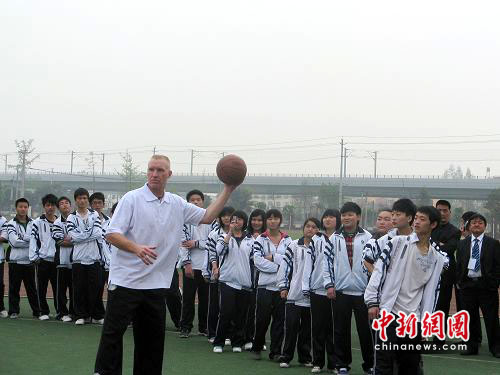 16日,NBA傳奇明星克里斯·穆林及NBA發(fā)展聯(lián)盟球員、北京奧神隊部分球員來到都江堰青城山高級中學,與320名該校籃球運動員一起進行籃球訓練活動。雖然語言不通,學生們?nèi)栽诖笄蛐堑膸ьI下傳球、運球、上籃,過足了一把NBA打球的癮。