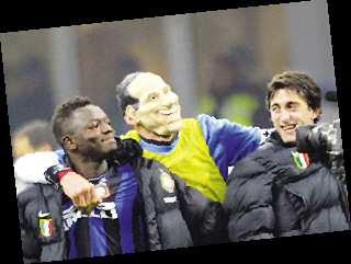 能在9人應戰、裁判判罰也不大利于自己的情況下取勝,國米球員們賽后當然也顯得興奮異常,隊長薩內蒂向球迷致敬,不少藍黑球員圍抱在一起跳舞唱歌,更為搞笑的是,國米替補鐵衛馬特拉齊,再度發揚自己惹是生非、挑釁對手的風格,居然戴上了一副不知道從哪里搞來的AC米蘭主席貝盧斯科尼的面具,來嘲諷這位丑聞不斷的意大利總理。盡管不能上場,但大馬善于嘲弄與惡搞對手的頑劣本性,依舊是沒有改變。而AC米蘭球迷與球員,在看到自己的球隊主席與老板,慘遭對手惡搞,只能是恨得牙癢癢,又無可奈何。