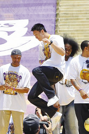 在杰克遜登臺(tái)之后,現(xiàn)場(chǎng)主持人開(kāi)始依次介紹湖人球員,而第一個(gè)被介紹的,就是湖人唯一的新秀,中國(guó)球員孫悅。在聽(tīng)到自己的名字被點(diǎn)到時(shí),孫悅顯得十分興奮,走到了舞臺(tái)的中央,并高高躍起在空中轉(zhuǎn)了一個(gè)圈,讓一些正在觀看的記者驚呼見(jiàn)到了“中國(guó)功夫”。