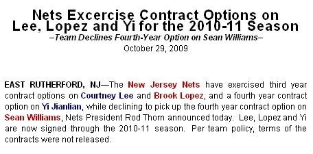 籃網此次執行的是易建聯的第四年合同選項,因為阿聯與雄鹿簽訂了2+2的新秀合約,即前兩年的固定保障加兩年合同選項。所以易建聯至少會為網隊效力到2010-11賽季結束。