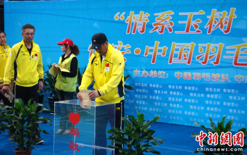 比賽開始前,中國羽毛球隊全體運動員、教練員和工作人員為玉樹災區進行現場捐款。此外,此次賑災義賽得到眾多企業的支持,恒安國際集團捐款50萬元人民幣,李寧(中國)體育用品有限公司、北京夢奧公司(聯邦快遞)、紅牛維他命飲料有限公司、喜得龍(中國)有限公司分別捐款10萬元。