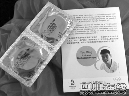 “奧運收藏第一人”趙曉凱在南京展示了這款特殊的奧運村避孕套,和普通款不同,這款避孕套不僅有英法文的介紹,還有舞動北京中國印的標志,更加獨特的是,外包裝上還有抗艾大使姚明的頭像(圖)。據悉,北京奧運期間,國際奧委會在奧運村放置了10萬避孕套預防艾滋病,姚明作為防艾滋病形象大使,他的肖像被印到了少量的“精裝版奧運村避孕套”上,在奧運后,這款避孕套成為奧運藏家熱追的藏品。“奧運收藏第一人”趙曉凱介紹,這是迄今為止他找到的第一款。趙曉凱表示,姚明版避孕套的拍賣所得,將用于救助只有14個月大的南京白血病患兒。(徐楊)