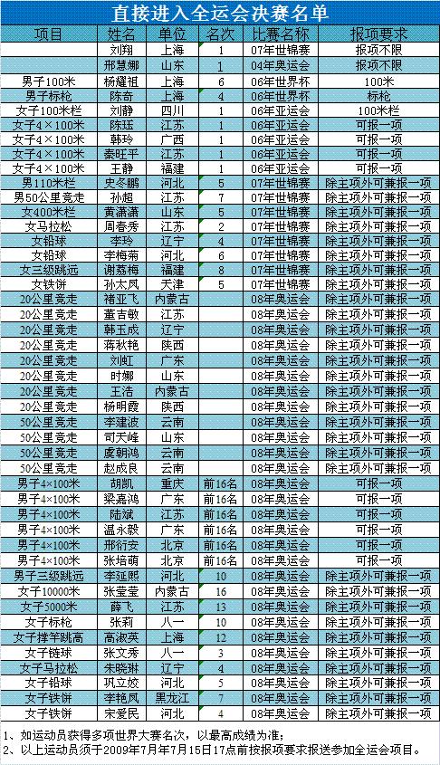 7月10日,中國(guó)田徑協(xié)會(huì)公布了直接進(jìn)入全運(yùn)會(huì)決賽的田徑運(yùn)動(dòng)員名單。劉翔、邢慧娜、黃瀟瀟、周春秀等45名選手列入名單。入選名單的運(yùn)動(dòng)員還必須在2009年7月15日17時(shí)前,按報(bào)名項(xiàng)目要求報(bào)送參加全運(yùn)會(huì)比賽的報(bào)名申請(qǐng)。