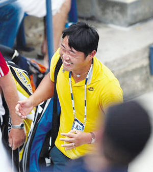 兩盤比賽,李娜沒有給對手任何機會,丈夫姜山在場下的表情逐漸變得豐富起來,不再是往常那樣的面無表情或者是淺淺的微笑,從他的臉上能看出明顯的情緒變化,滿臉的笑容能夠讓所有人感受到他的興奮。第二盤在自己的發(fā)球局里,李娜連得三分拿到三個賽點,并且在第一個賽點出現(xiàn)時就拿下比賽。李娜在賽場內蹦了起來,姜山和托馬斯在場外也是一陣狂喜,姜山的眼睛瞇成了一條縫,嘴也快咧到耳根。跟往常一樣,姜山和托馬斯在比賽結束之后就背著球包離開。他和托馬斯一邊走一邊聊天,不斷有球迷從他們倆中間穿過,這絲毫沒有影響兩人的好心情,他們很興奮地一邊聊天一邊比劃著。姜山伸出食指指向天空,難道是已經(jīng)將目標瞄準了第一嗎?