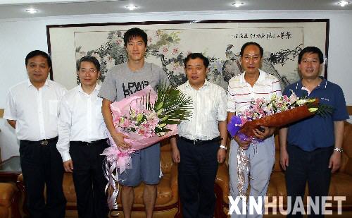 上海莘莊訓(xùn)練基地,上海市普陀區(qū)委書記周國雄等人當(dāng)日代表普陀父老鄉(xiāng)親為即將出征全運(yùn)會(huì)的劉翔壯行——?jiǎng)⑾枋恰巴辽灵L(zhǎng)”的普陀人。灰色T恤,灰色短褲,踏一雙亮黃色的運(yùn)動(dòng)鞋,剛睡過午覺的劉翔看起來氣色不錯(cuò)。