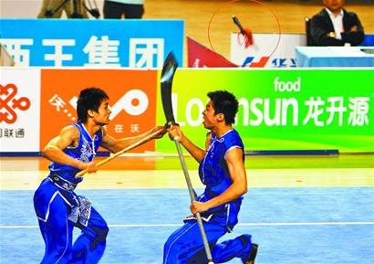 本以為昨天的兩次斷棍事故會(huì)給所有參賽隊(duì)敲響警鐘,但通過今晚的比賽來(lái)看,起碼廣西隊(duì)和已經(jīng)出現(xiàn)過一次事故的四川隊(duì)并沒有重視比賽器材的選擇和維護(hù)。在男子對(duì)練比賽中,廣西隊(duì)的黃俊華/黃杰第三個(gè)出場(chǎng),他們表演的項(xiàng)目是樸刀進(jìn)槍,也就是長(zhǎng)刀與長(zhǎng)槍的對(duì)抗。比賽進(jìn)行到了一半,黃俊華一刀砍向使槍的黃杰,長(zhǎng)槍抬起格擋時(shí)意外發(fā)生,長(zhǎng)槍的木桿與刀刃接觸后立刻斷為兩截,廣西隊(duì)本項(xiàng)比賽沒有獲得成績(jī)。