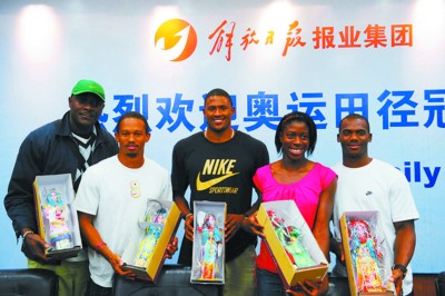 座談會上,還有北京奧運會男子4×100米冠軍成員,牙買加隊的弗雷德和卡特,北京奧運會女子400米金牌獲得者奧古魯格,雅典奧運會和北京奧運會兩屆女子三級跳冠軍姆邦哥。他們和奧利弗,都是第一批抵達上海參加黃金大獎賽的運動員,此次受到解放日報報業集團和解放日報領導的熱忱接待,并因收到了如穆桂英、孫悟空、趙云等京劇人偶,以及中國筷子等極具中國特色的禮物,而充滿驚喜。