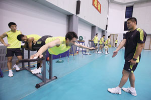 在兩個多小時的體能訓練中,陳豐的“招數”除了用語言調動隊員的激情外,還不停地對訓練內容“花樣翻新”。每10分鐘左右,他就吹一聲哨子,抻拉肌肉換成慢跑、慢跑換成啞鈴、啞鈴換成杠鈴……