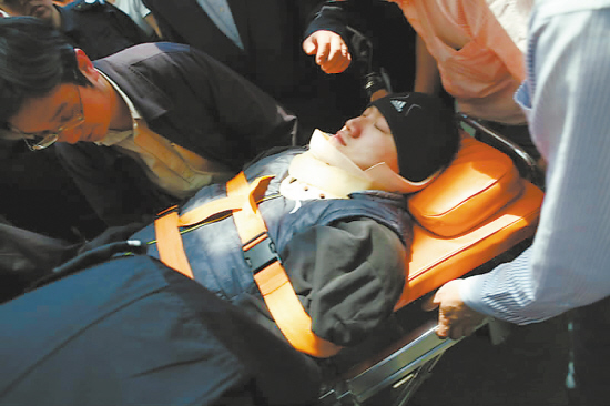 “帽子!借頂帽子!” 幾位先行下車的陪同人員,先從醫(yī)院保安那借了頂帽子。大約3分鐘后,車門才打開,躺在擔(dān)架上的湯淼被6名保安抬下車,并徑直送往病房——雖然氣溫高達(dá)27攝氏度,湯淼仍穿著大衣,戴著線帽,就連臉部也被那頂保安帽遮得嚴(yán)嚴(yán)實實。