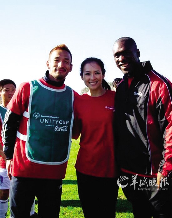 據悉,章子怡于2006年起擔任特奧會全球形象大使,至今已有4個年頭。這一次,特奧會舉辦的“團結杯”比賽旨在讓全社會接納和包容智障人士。章子怡說:“這次在世界杯期間受邀來到南非,主要是希望通過足球這項大家都熱愛的運動,讓更多人了解智障這個群體!绷硗,和特奧運動員一起參加比賽練習的還有“亞洲足球先生”中田英壽、NBA球星迪坎貝·穆托姆博、AC米蘭隊員克拉倫斯·西多夫等。在練習過程中,章子怡還跟中田英壽學習背后傳接球的動作,沒想到還一次成功,贏得了現場很多人的掌聲。