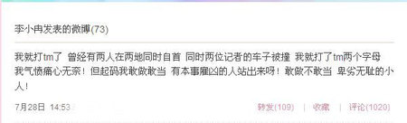 最近福建兩位記者因揭露“紫金礦業(yè)”,結(jié)果在同一天兩位記者的車子同時(shí)被撞。李小冉尤其關(guān)注這則新聞,她在昨日中午的微博中發(fā)飆:“天災(zāi)就夠叫人無(wú)奈的了,人禍也是沒(méi)完沒(méi)了。”她還 在微博中爆粗口,引來(lái)粉絲圍觀,認(rèn)為其有損形象。