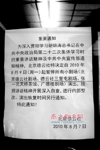 7日凌晨,德云社在其官網(wǎng)德云相聲網(wǎng)上發(fā)表聲明,表示從9日起將停止所有小劇場演出,“北京德云社特決定自2010年8月9日(周一)起暫停所有小劇場的常規(guī)演出,進行內(nèi)部整改。具體的演出恢復時間,將根據(jù)實際情況另行通知。特此通告!甭暶鱾鞒,南都記者第一時間和德云社副總經(jīng)理王海取得了聯(lián)系,電話中,王海拒絕對此事發(fā)表任何評論,只是表示“演出近期內(nèi)都不會恢復”。