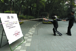 在公園門口和警戒線旁,均貼出落款為公園管理處的通知:“因公園9月25日有重要活動(dòng),需占用此場地,望各晨練群體暫停活動(dòng)1天”,通知中的時(shí)間部分有被白紙粘貼的痕跡。