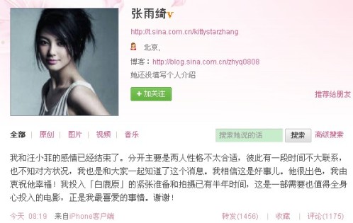 張雨綺在微博中表示:“我和汪小菲的感情已經(jīng)結束了。分開主要是兩人性格不太合適,彼此有一段時間不大聯(lián)系,也不知對方狀況,我也是和大家一起知道了這個消息。我相信這是好事兒。他很出色,我由衷祝他幸福!我投入《白鹿原》的緊張準備和拍攝已有半年時間,這是一部需要也值得全身心投入的電影,正是我最喜愛的事情。謝謝!”