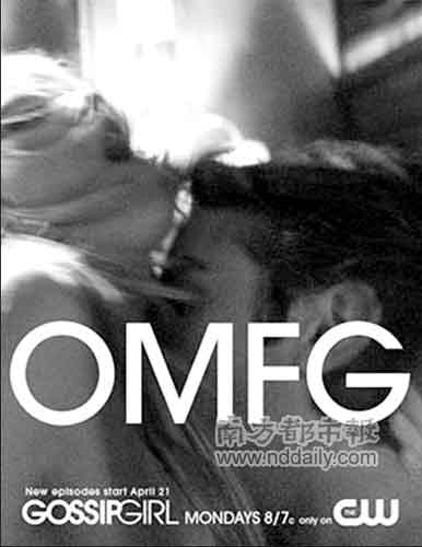 《緋聞女孩》是今年CW電視臺的新劇,由曾經紅極一時的《橘子郡男孩》(TheO.C.)制作人打造,盡管收視率同樣不高,但是在全美掀起了新的時尚潮流。作為偶像劇,劇情并沒有特別的新意,但是該劇制作非常精良,從音樂到服飾,全部走在時尚最前沿,再加上光鮮亮麗的主演,在劇中盡情的談情說愛,十分養眼,在美國成為高中生追捧的話題劇集。經過編劇罷工風波,《GossipGirl》最近重返美國小屏幕,為了打響聲勢,CW電視網制作兩款海報,引起不少爭議,其中一款以主角C和B的激吻為畫面,另一款主打S和N上床的激情戲,并打上“OMFG”的大字。