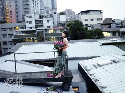 為了表達“花與女孩”的主題,林嘉欣裸露上半身,只以長發遮掩胸部,照片的確很有味道,一點色情感覺都沒有。圖片均來自香港《明報》。